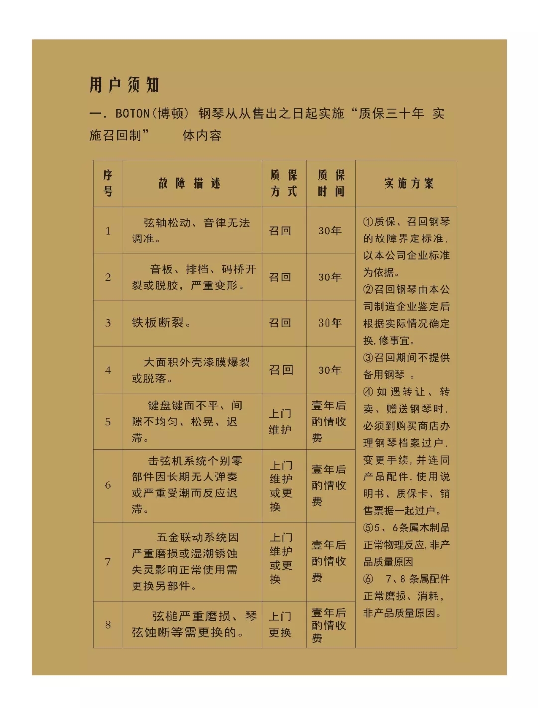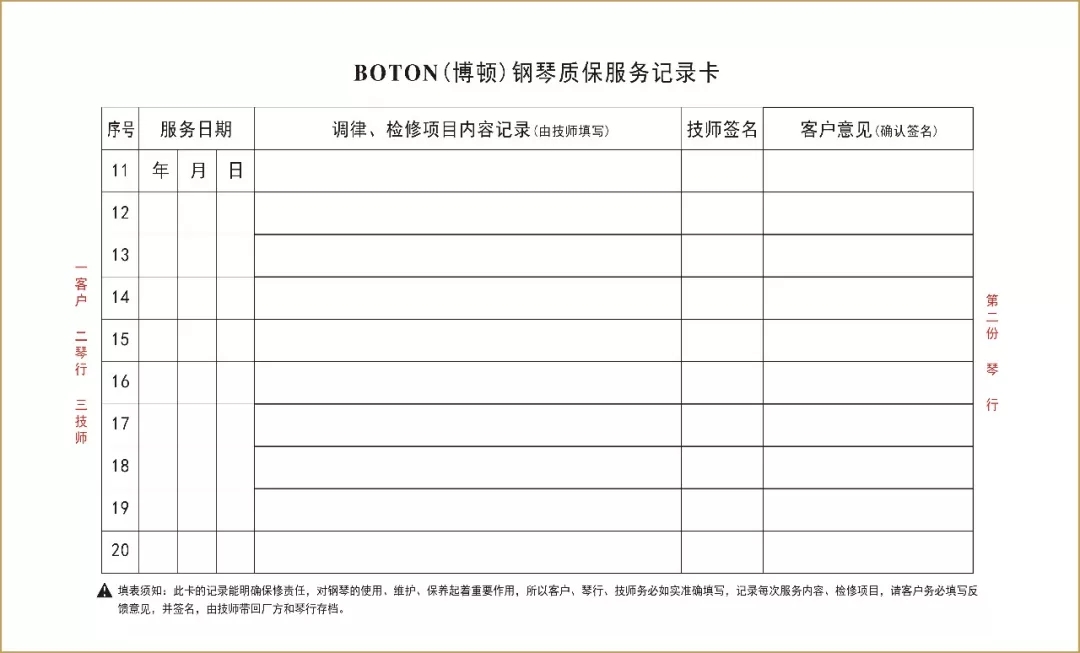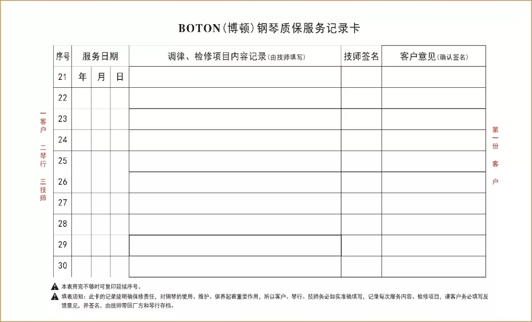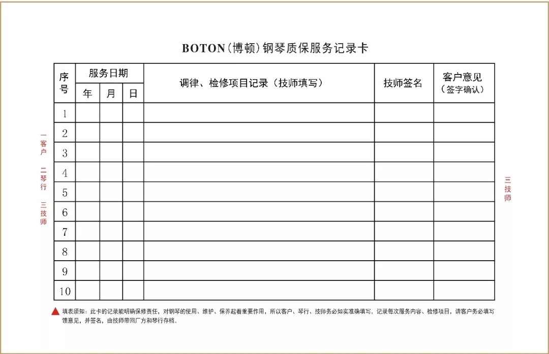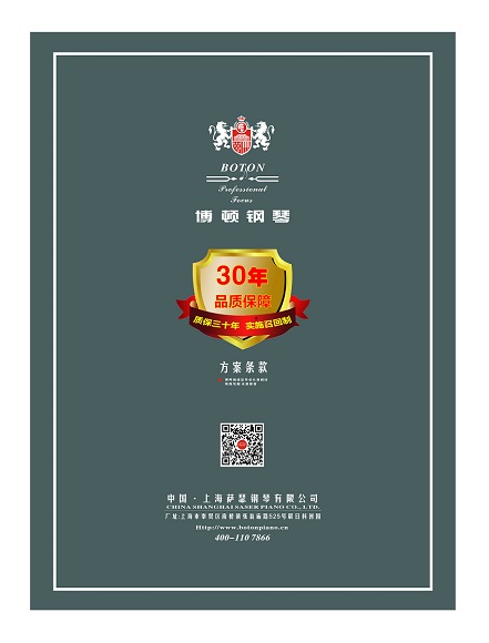 尊敬的用戶,熱烈歡迎您已成為BOTON(博頓)鋼琴用戶大家庭中的一員,祝賀您以睿智的目光選擇了我們的產品,我們將為您提供卓越的品質和一流的服務。BOTON鋼琴從在中國大陸注冊成立生產十五年以來,在各項技術指標和制作工藝上都嚴格按照德國鋼琴工藝標準生產制造,迄今為止已在生產和銷售方面有了長足的發展,特別是在產品質量上多項指標已遠遠超過中國樂器行業國家標準和同行水平。現已被作為上海音樂學院國際鋼琴大師班演奏用琴;西安音樂學院鋼琴系,新疆師范大學音樂學院,上海交響樂團、合唱團演奏用琴;美國奧柏林國際鋼琴大賽中國賽區指定用琴;上海國際書展專家指定演示用琴;上海浦東國際機場T2航站樓迎賓大廳形象展示指定用琴;廈門高崎國際機場迎賓大廳形象展示用情等。在銷售商和消費者心目中已經建立起了良好的品質形象和信譽,品牌效應也日見彰顯。為了酬謝廣大BOTON用戶的厚愛,確保BOTON鋼琴的恒久卓越,我們特聯合特約經銷商向BOTON用戶提供:1、電話定時回訪;2、上門跟蹤服務;3、特設咨詢和監督投訴專線電話;4、對產品品質的保障管理切實實行“質保30年實施召回制”。