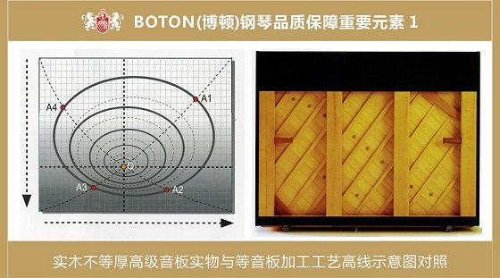 實木橋碼與肋木夾角的科學計算。如何將一個源振動均勻地、即時地傳布到整個音板上(而不是局部的、遲緩的),這需要對每一個肋木與橋碼的夾角進行科學計算。BOTON鋼琴肋木與橋碼的夾角計算采用余弦補償法,盡可能使整個音板完全振動起來,音質才會有爆發力。