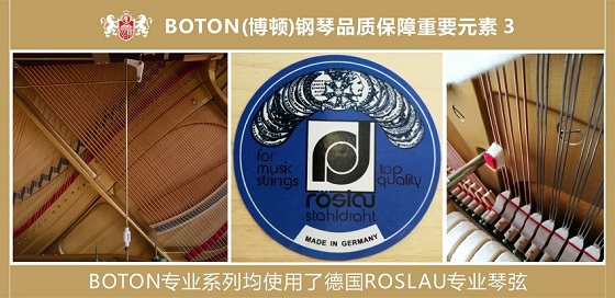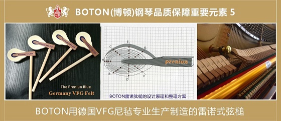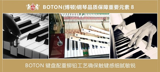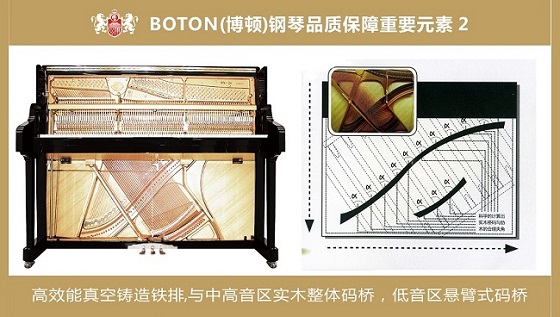BOTON(博頓)鋼琴采用不等厚非對稱曲面分布,加強低音的共鳴,各音區音色連貫、統一和飽滿。