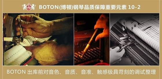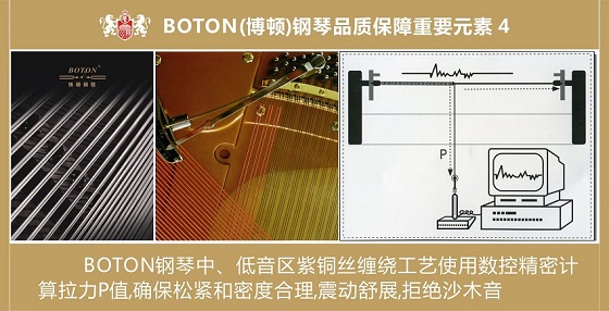 鋼絲的內應力消除的低音銅線纏繞工藝;鋼絲冶煉后,金相結構中必有內應力存在,造成雜音或音色不統一。BOTON鋼琴徹底拒絕雜音。對低音銅線纏繞工藝的拉力P采用全程計算機控制,保證低音渾厚且不失清晰。