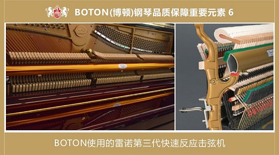擊弦機作為鋼琴的心臟部分,BOTON(博頓)鋼琴選用歐洲 “格良木”確保材性穩定, 使用 “雷諾” 設計第三代機型,確保擊弦效率,進而更好體現 “雷諾”擊弦機的優勢 “傳動敏捷,手感細膩,層次分明,惟妙惟肖”。