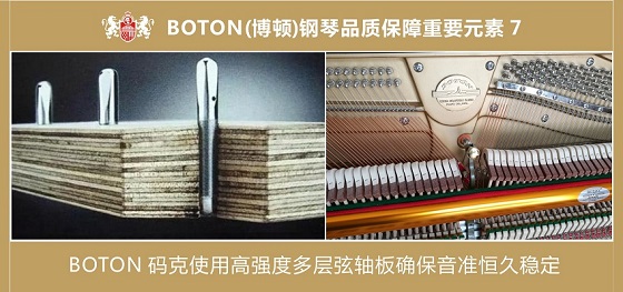 全數控一次成型弦軸板;BOTON(博頓)鋼琴采取三種機制確保鋼琴音高準確,音律穩定,①選材使用優質多層合成弦軸板,抵消木材熱脹冷縮及濕潮引發弦軸孔徑變化。②全數控一次成型開孔確保孔徑垂直仰角由低到高音區準確控制在6-4度,從力矩原理上保障弦軸張力和穩定。③使用專利產品多螺紋合金材料弦軸銷確保弦軸扭力穩固不松動。