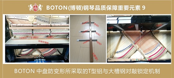 BOTON(博頓)鋼琴為了防止因為溫度、濕度、干寒、暖氣輻射引發的中盤變形,特別使用了專業定制的"T型鋁”、“加強型大槽鋼”并采取中盤三段式鋸斷,取槽鑲嵌“T型鋁”,對敲大邦檔槽鋼,以對敲螺絲鎖死的固定辦法,確保了極端環境下鋼琴的正常使用。