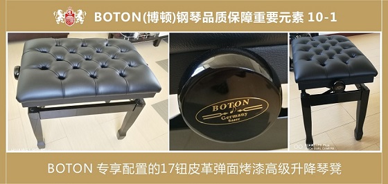 BOTON(博頓)鋼琴琴凳作為重要標準配置,統一采用實木烤漆,17鈕軟面皮革,實木手柄,輕松升降無噪音高級琴凳。確保快速成長中的琴童適時調整最佳彈奏坐姿。