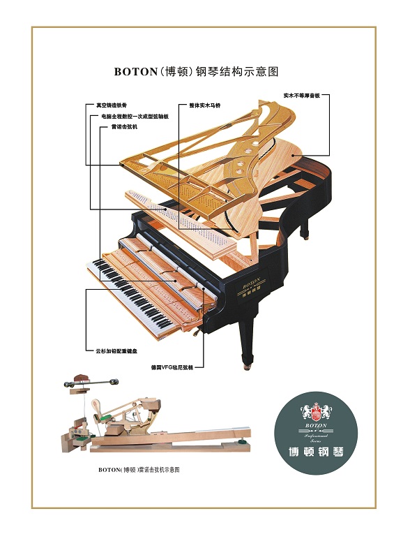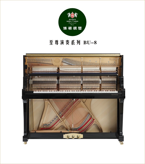 BOTON(博頓)鋼琴采用不等厚非對稱曲面分布,加強低音的共鳴,各音區音色連貫、統一和飽滿。