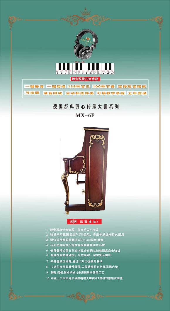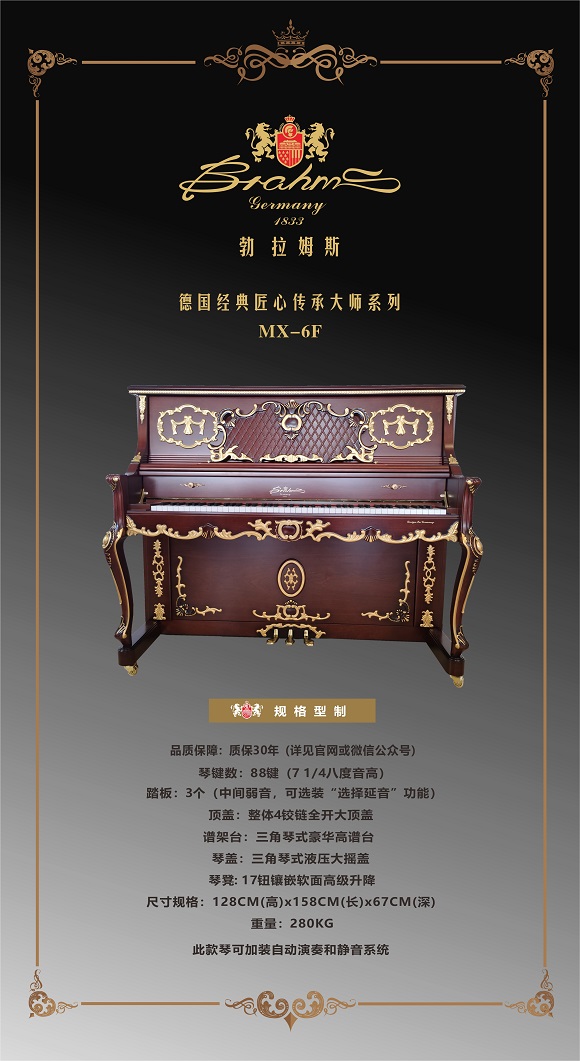 尊敬的用戶,熱烈歡迎您已成為勃拉姆斯 Brahms 鋼琴用戶大家庭中的一員,祝賀您以睿智的目光選擇了我們的產品,我們將為您提供卓越的品質和一流的服務。Brahms 鋼琴從進入中國大陸20年以來,在各項技術指標和制作工藝上都嚴格按照德國鋼琴工藝標準生產制造,迄今為止已在生產和銷售方面有了長足的發展,特別是在產品質量上多項指標已遠遠超過中國樂器行業國家標準和同行水平?,F已被作為上海音樂學院國際鋼琴大師班演奏用琴;美國奧柏林國際鋼琴大賽中國賽區指定用琴;上海國際書展專家指定演示用琴;上海浦東國際機場T2航站樓迎賓大廳形象展示指定用琴;廈門高崎國際機場迎賓大廳形象展示用情等。在銷售商和消費者心目中已經建立起了良好的品質形象和信譽,品牌效應也日見彰顯。為了酬謝廣大Brahms 用戶的厚愛,確保Brahms 鋼琴的恒久卓越,我們特聯合特約經銷商向 Brahms 用戶提供:1、電話定時回訪;2、上門跟蹤服務;3、特設咨詢和監督投訴專線電話;4、對產品品質的保障管理切實實行 “質保30年,實施召回制”。