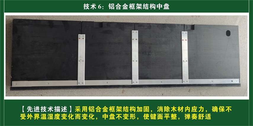 BOTON(博頓)鋼琴為了防止因為溫度、濕度、干寒、暖氣輻射引發的中盤變形,特別使用了專業定制的"T型鋁”、“加強型大槽鋼”并采取中盤三段式鋸斷,取槽鑲嵌“T型鋁”,對敲大邦檔槽鋼,以對敲螺絲鎖死的固定辦法,確保了極端環境下鋼琴的正常使用。