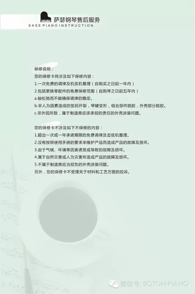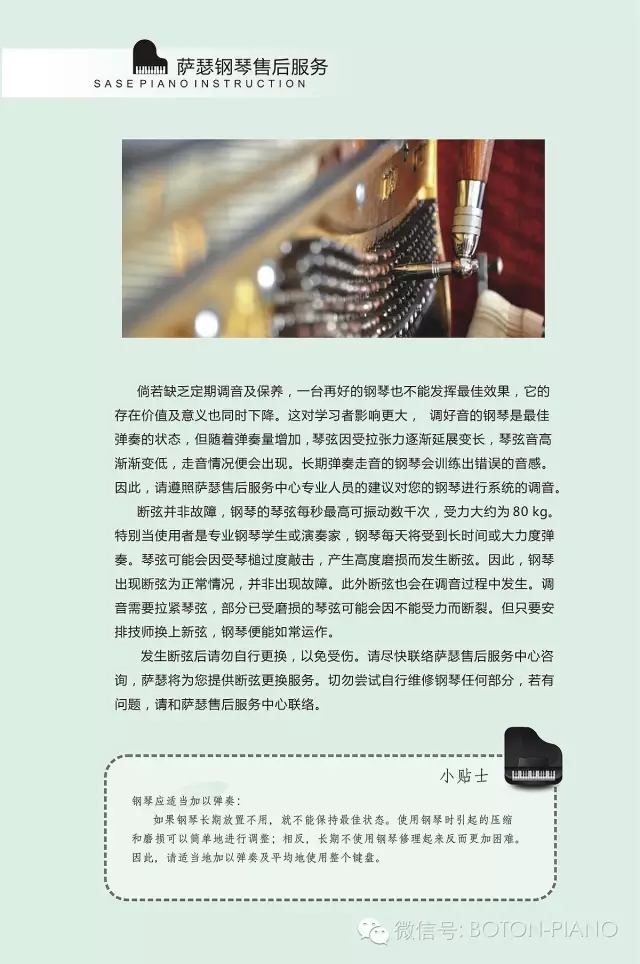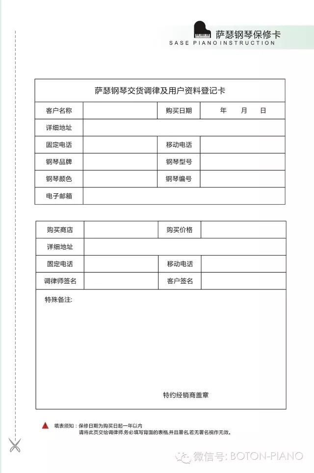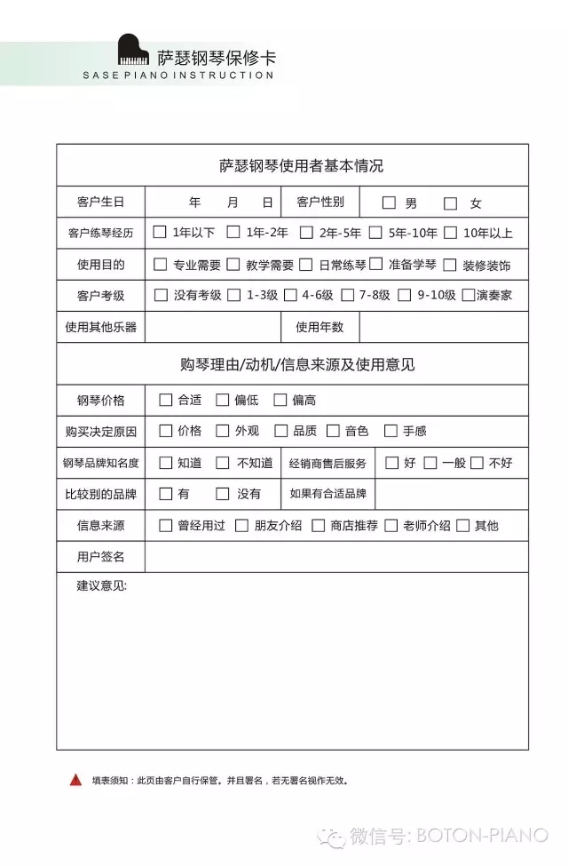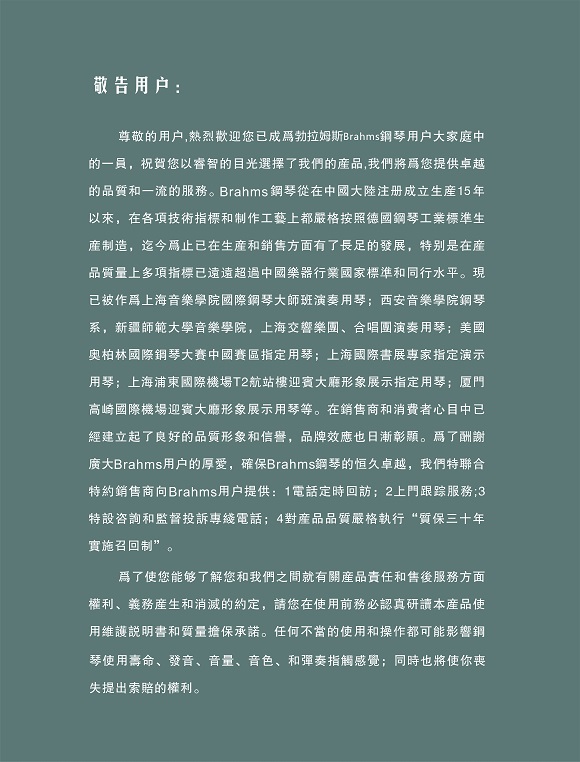 尊敬的用戶,熱烈歡迎您已成為勃拉姆斯 Brahms 鋼琴用戶大家庭中的一員,祝賀您以睿智的目光選擇了我們的產(chǎn)品,我們將為您提供卓越的品質(zhì)和一流的服務。Brahms 鋼琴從進入中國大陸20年以來,在各項技術(shù)指標和制作工藝上都嚴格按照德國鋼琴工藝標準生產(chǎn)制造,迄今為止已在生產(chǎn)和銷售方面有了長足的發(fā)展,特別是在產(chǎn)品質(zhì)量上多項指標已遠遠超過中國樂器行業(yè)國家標準和同行水平。現(xiàn)已被作為上海音樂學院國際鋼琴大師班演奏用琴;美國奧柏林國際鋼琴大賽中國賽區(qū)指定用琴;上海國際書展專家指定演示用琴;上海浦東國際機場T2航站樓迎賓大廳形象展示指定用琴;廈門高崎國際機場迎賓大廳形象展示用情等。在銷售商和消費者心目中已經(jīng)建立起了良好的品質(zhì)形象和信譽,品牌效應也日見彰顯。為了酬謝廣大Brahms 用戶的厚愛,確保Brahms 鋼琴的恒久卓越,我們特聯(lián)合特約經(jīng)銷商向 Brahms 用戶提供:1、電話定時回訪;2、上門跟蹤服務;3、特設咨詢和監(jiān)督投訴專線電話;4、對產(chǎn)品品質(zhì)的保障管理切實實行 “質(zhì)保30年,實施召回制”。