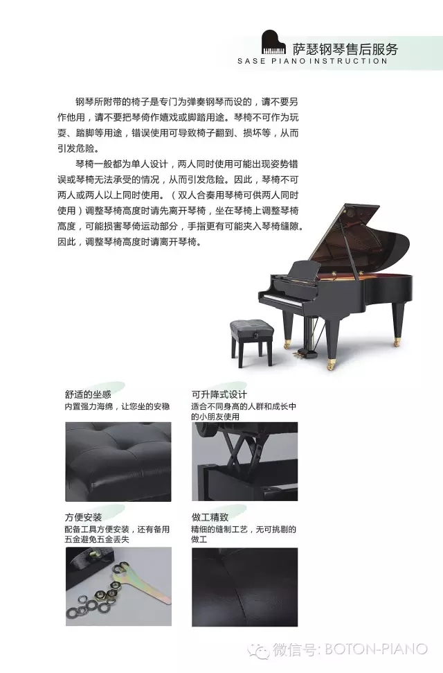 Brahms 鋼琴琴凳作為重要標準配置,統(tǒng)一采用實木烤漆,17鈕軟面皮革,實木手柄,輕松升降無噪音高級琴凳。確保快速成長中的琴童適時調(diào)整最佳彈奏坐姿。