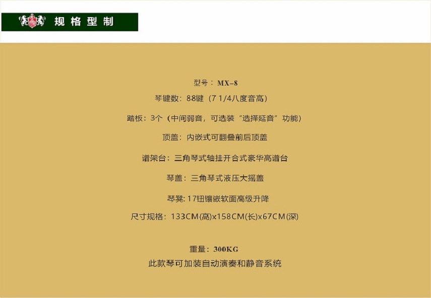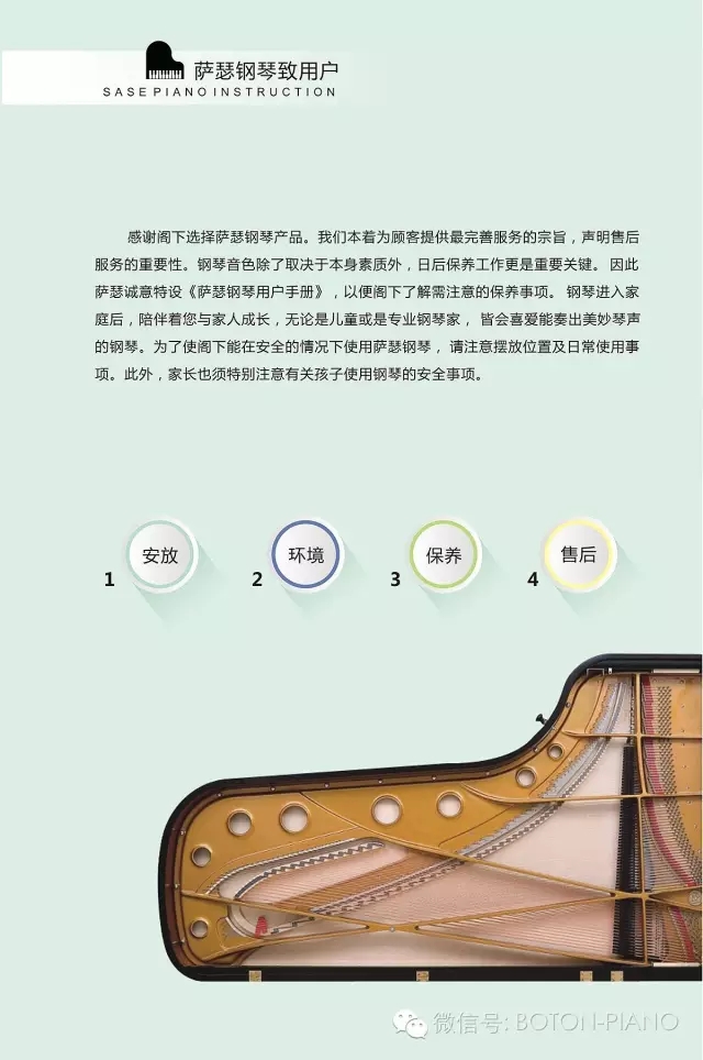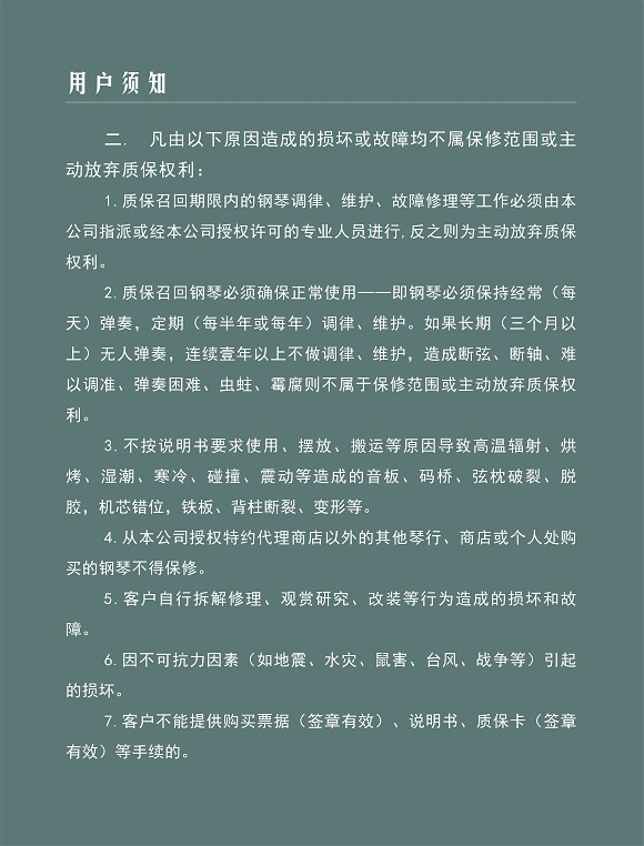 為了使您能夠更加詳盡全面了解鋼琴的性能、特征和使用、保養(yǎng)等注意事項,也了解您和我們之間就有關(guān)產(chǎn)品責任和售后服務方面權(quán)利、義務產(chǎn)生和消除的約定,請您在使用前務必認真研讀本產(chǎn)品使用維護說明書和質(zhì)量擔保承諾。任何不當?shù)氖褂煤筒僮鞫伎赡苡绊戜撉偈褂脡勖l(fā)音、音量、音色、和彈奏指觸感覺;同時也將使你喪失提出索賠的權(quán)利。
