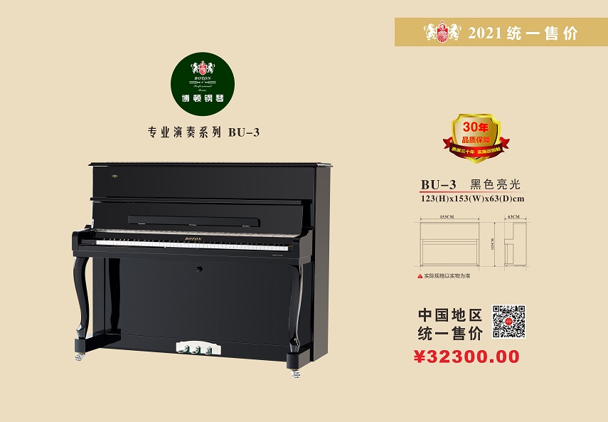 尊敬的用戶,熱烈歡迎您已成為BOTON(博頓)鋼琴用戶大家庭中的一員,祝賀您以睿智的目光選擇了我們的產品,我們將為您提供卓越的品質和一流的服務。BOTON鋼琴從在中國大陸注冊成立生產十五年以來,在各項技術指標和制作工藝上都嚴格按照德國鋼琴工藝標準生產制造,迄今為止已在生產和銷售方面有了長足的發展,特別是在產品質量上多項指標已遠遠超過中國樂器行業國家標準和同行水平。現已被作為上海音樂學院國際鋼琴大師班演奏用琴;西安音樂學院鋼琴系,新疆師范大學音樂學院,上海交響樂團、合唱團演奏用琴;美國奧柏林國際鋼琴大賽中國賽區指定用琴;上海國際書展專家指定演示用琴;上海浦東國際機場T2航站樓迎賓大廳形象展示指定用琴;廈門高崎國際機場迎賓大廳形象展示用情等。在銷售商和消費者心目中已經建立起了良好的品質形象和信譽,品牌效應也日見彰顯。為了酬謝廣大BOTON用戶的厚愛,確保BOTON鋼琴的恒久卓越,我們特聯合特約經銷商向BOTON用戶提供:1、電話定時回訪;2、上門跟蹤服務;3、特設咨詢和監督投訴專線電話;4、對產品品質的保障管理切實實行“質保30年實施召回制”。
